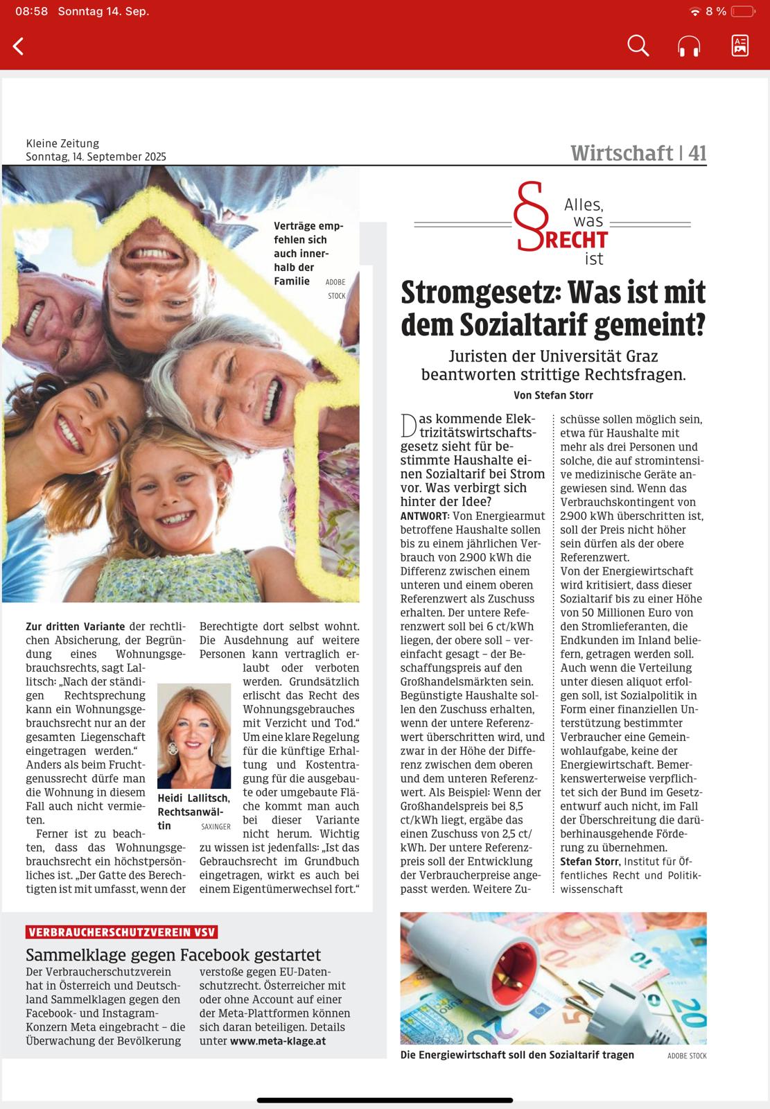 Der Artikel “Stromgesetz: Was ist mit dem Sozialtarif gemeint?” von Univ.-Prof. Dr. Stefan Storr wurde am 14. September 2025 in der Kleinen Zeitung veröffentlicht.