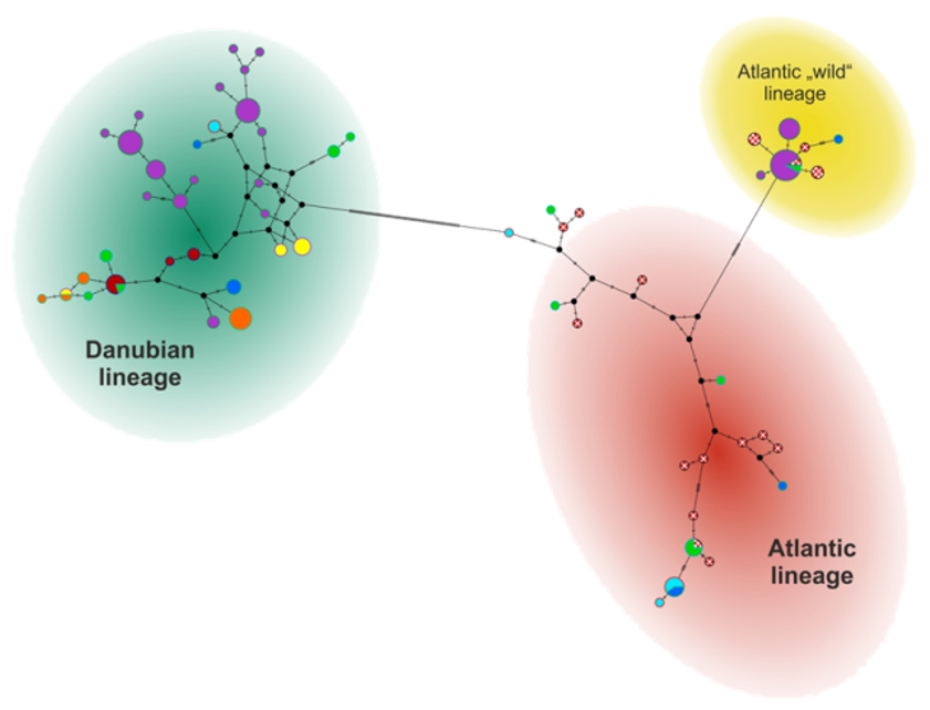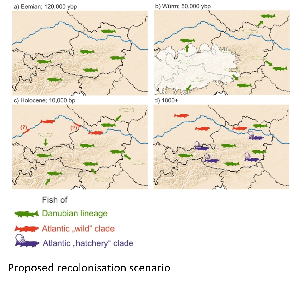 This project aimed to describe the genetic composition of wild and farmed populations of brown trout in Austria. A high-resolution typing protocol was developed, including 17 microsatellite loci and sequencing of >6,000 bp of mitochondrial DNA. Examination of several wild populations led us to formulate the following hypothesis about the postglacial recolonization of brown trout in Austria : First, there was a postglacial expansion of the range of the so-called Danubian genetic lineage into large parts of Austria. In a second wave of range expansions, the Atlantic lineage also migrated into areas of Upper and Lower Austria. During the 20th century, another Atlantic lineage was introduced by extensive stocking by humans. Between the pure Danubian populations we found strong differences and splitting times, which date back to the last interglacial (about 120,000 years ago). While autochthonous wild populations seem to be more influenced by genetic drift, we observed relatively stronger selection pressure on adaptive loci in breeding populations. Because environmental conditions in farms are usually drastically different from those in the wild, this selection pressure could favor genetic variants that are detrimental to fish exposed in a natural environment.